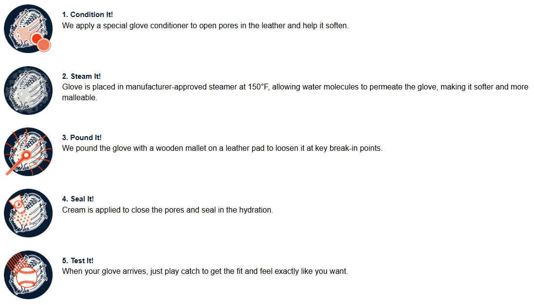 By choosing to add glove steaming to your cart, you've not only purchased a great new softball glove, but also permitted us to make it almost game day ready. You won't have to spend hours shaping and forming it, or worry about breaking it in the wrong way. It will be soft, flexible and ready to adapt to your specific hand and catching style.