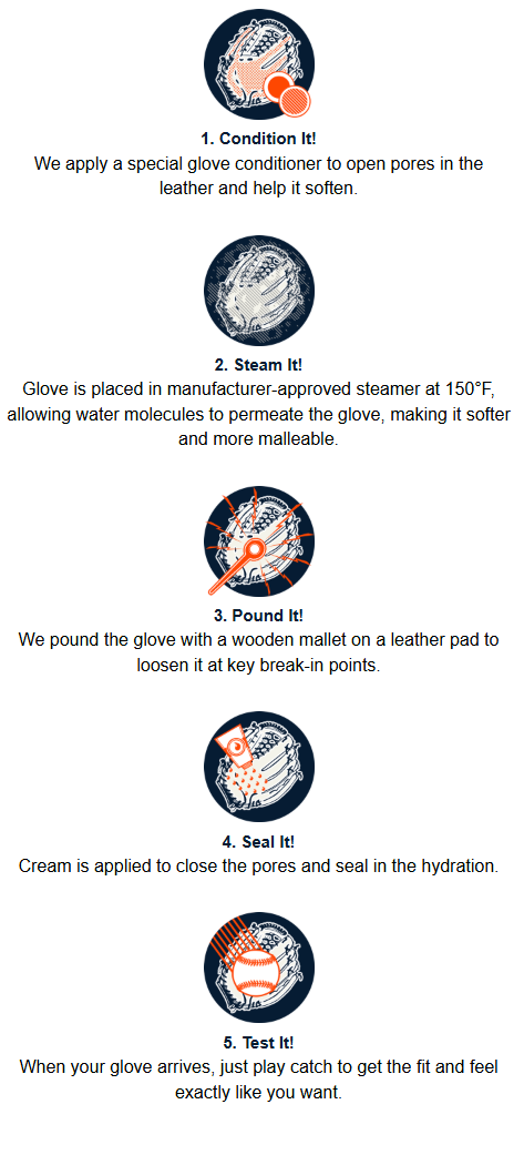 NOTE: We do not accept returns on gloves that have been steamed. The glove will come with a ball placed inside to help form the pocket and will be wrapped with bands to help maintain the shape.